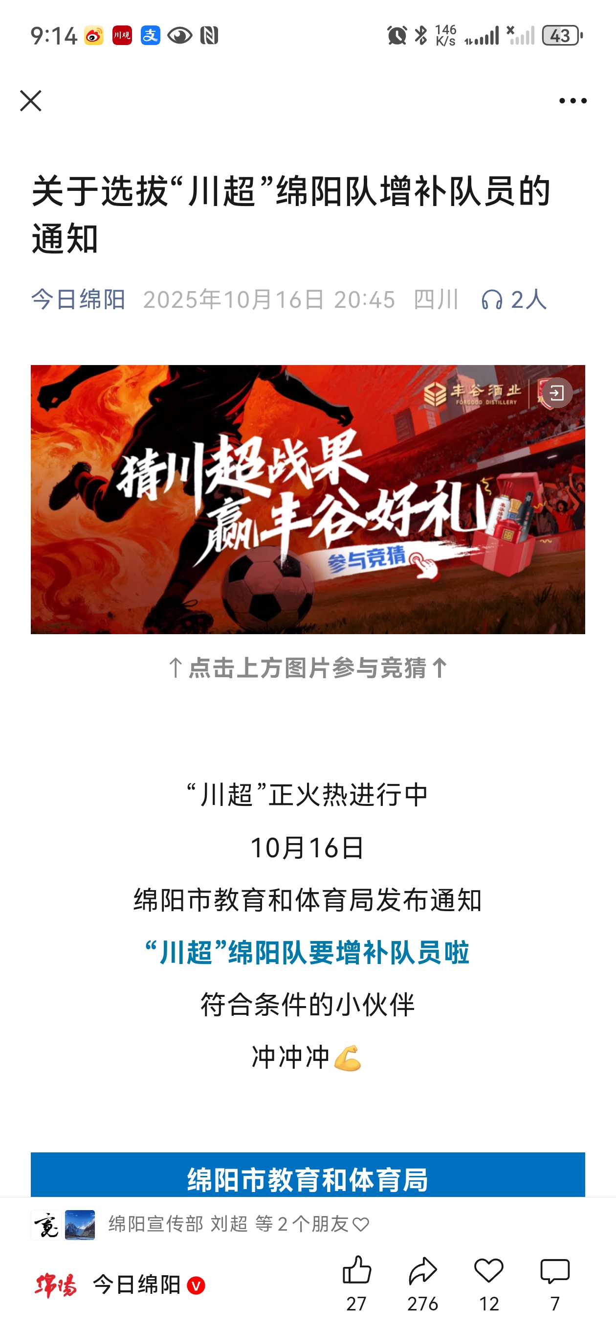 10月16日,绵阳市教育和体育局发布《关于选拔“川超”绵阳队增补队员的通知》(下称《通知》)。
